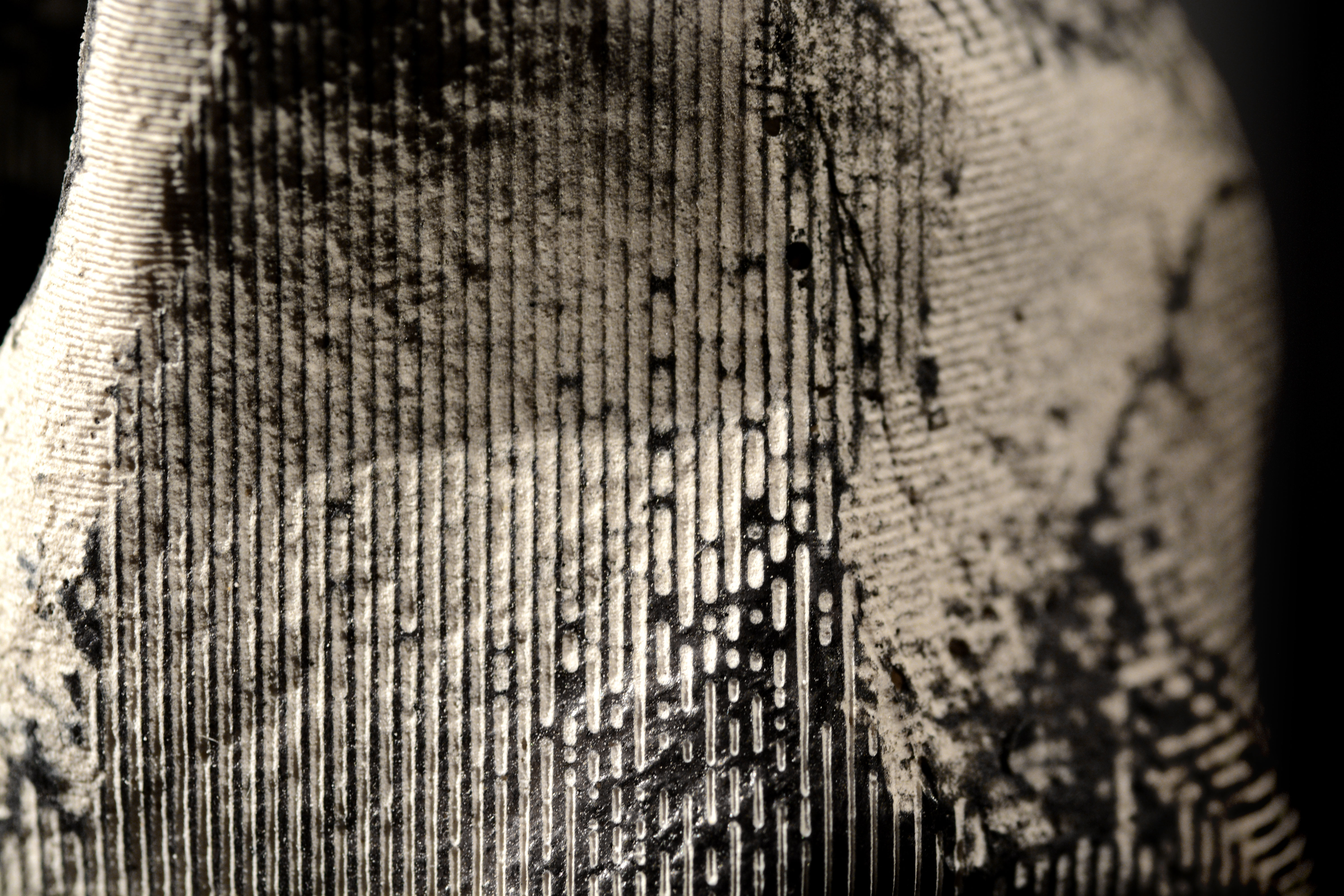 Usually, laser etching engraves/burns the image into a material so that dark zones in the image are burnt, white zones are left untouched. My digital sgraffito etching process reverses this logic: a black spot in the image will be engraved onto the object so that it reveals the white plaster underneath the layer of ink, so that effectively, a negative of the input image is created.